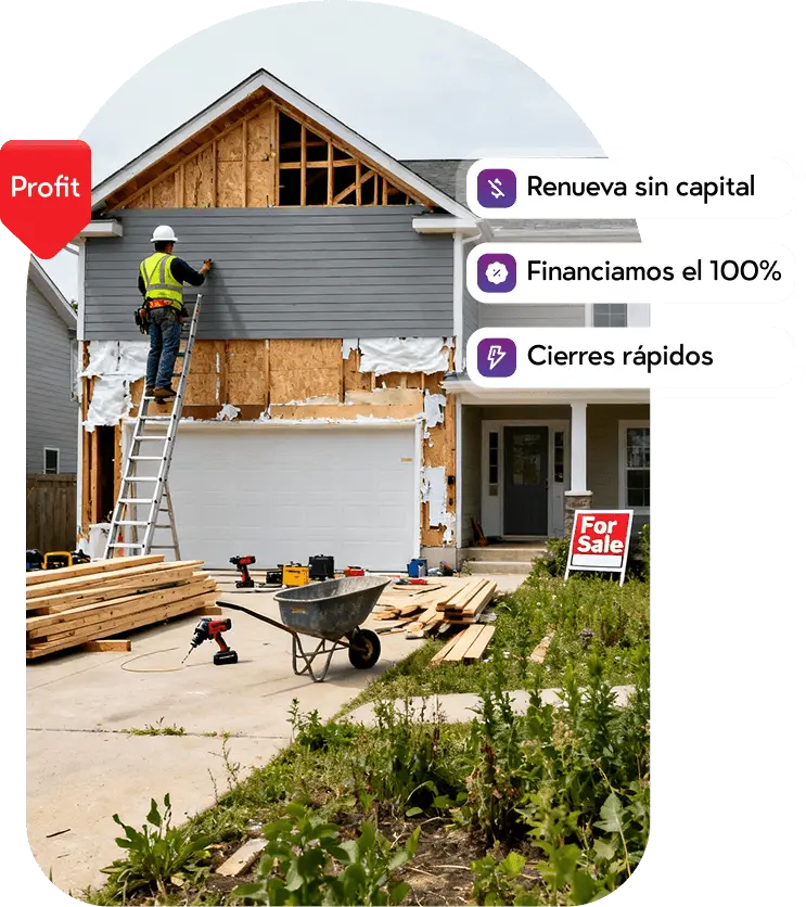 Financiamiento de hasta el 90% de la compra y 100% de la remodelación, basado en el valor futuro de la propiedad (ARV).